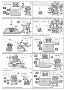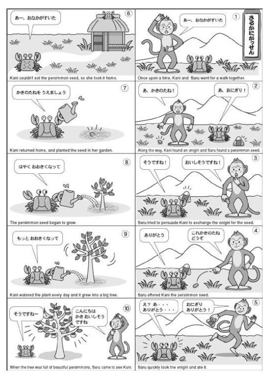 さるかにがっせん, also known as “The battle of the monkey and the crab” is a Japanese folktale. さるかにがっせん is a cautionary tale, which warns against greed, selfishness, and cruelty. In this story, a greedy monkey (さる) tricks a crab (かに) into swapping a rice ball (おにぎり) for a persimmon seed (かきのたね). When the tree bears fruit, the monkey steals the persimmons and injures the crab. However, with the help of the crab’s children and their friends, the monkey is made to see the error of his ways.