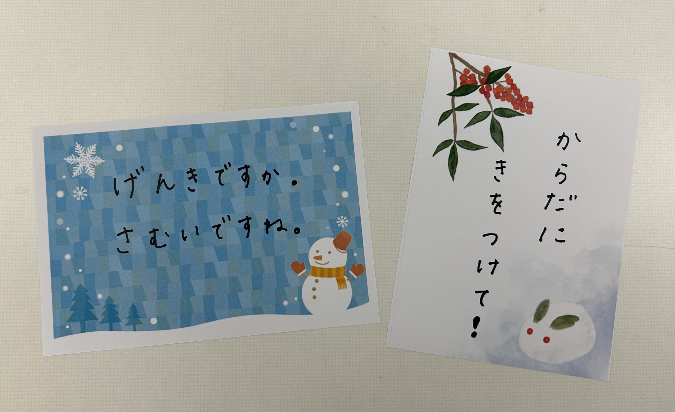 Let’s try making a card by drawing pictures such as snowmen or snow rabbits.
